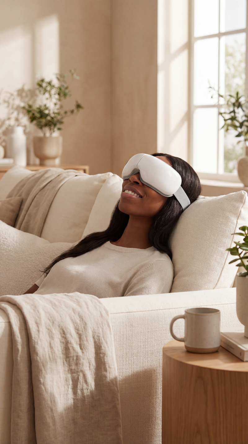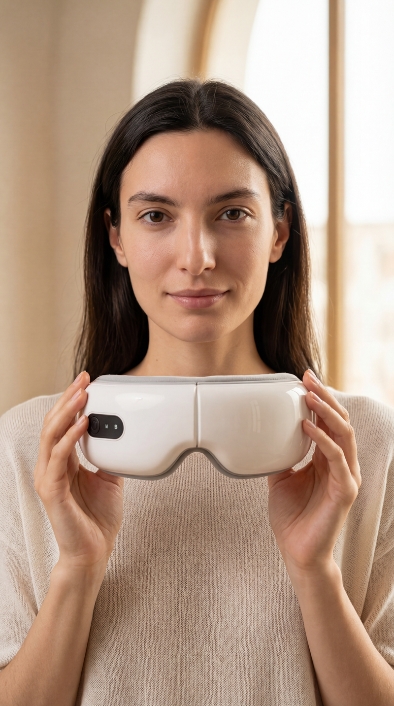 This device utilizes rhythmic thermal compression to soothe ocular pressure and relieve chronic migraines.
